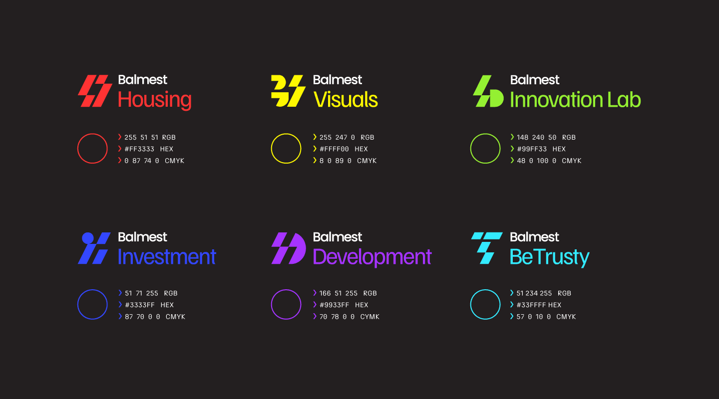 The branding embodies modernity and versatility, creating a visual identity that feels both innovative and trustworthy. The graphic system enhances Balmest’s diverse business units while maintaining a cohesive narrative across all platforms.