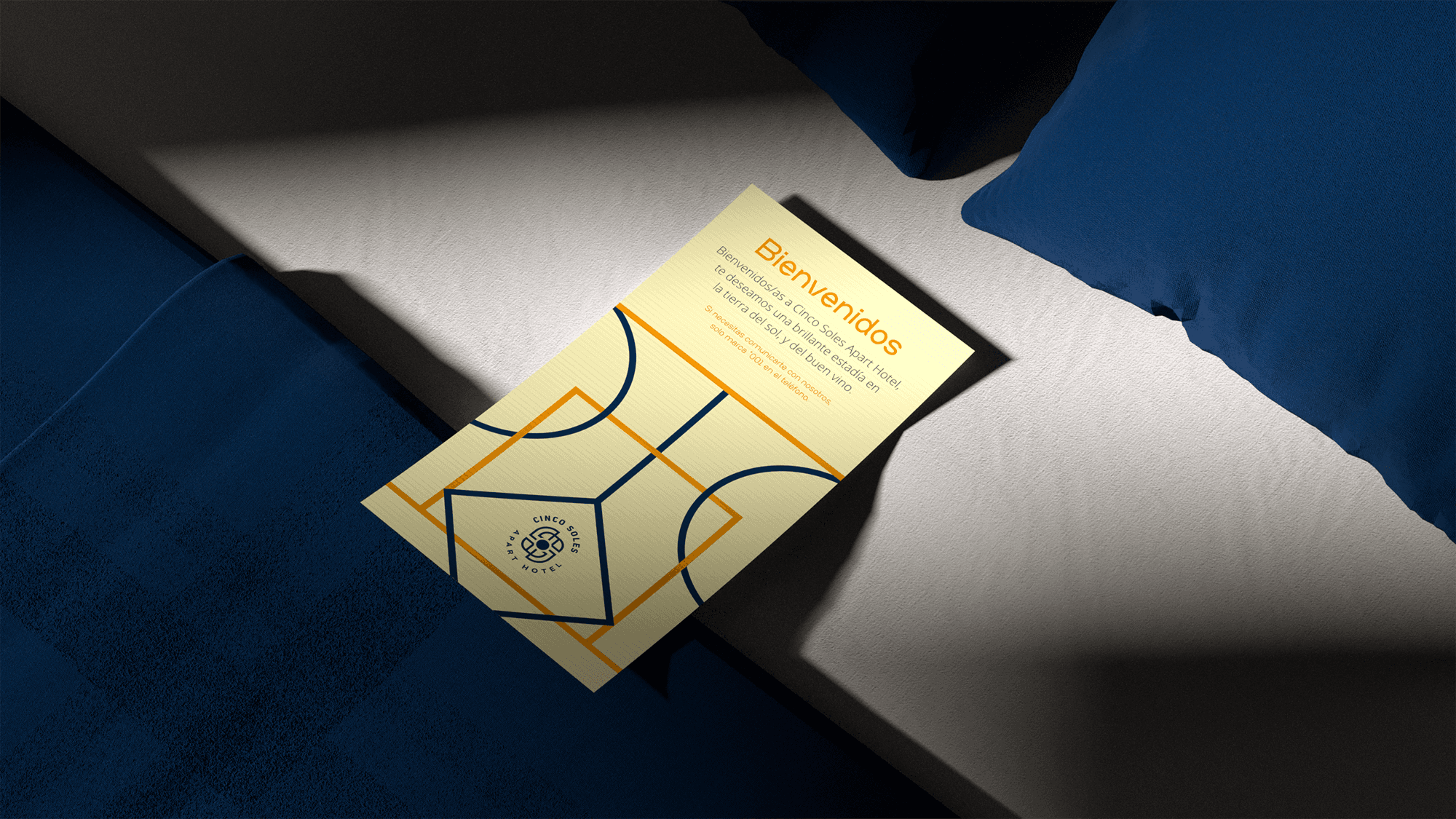 Inspired by the modular elegance of the hotel’s architecture and the symbolism behind its name, the branding captures the essence of Cinco Soles. The isotype blends geometric precision with visual storytelling. A rich visual identity that extends beyond the logo, permeating the hotel’s walls and decor with modular patterns that echo its structural philosophy. The color palette of vibrant yellows and oranges conveys warmth and energy, while a sophisticated blue adds depth and balance, creating a harmonious aesthetic.