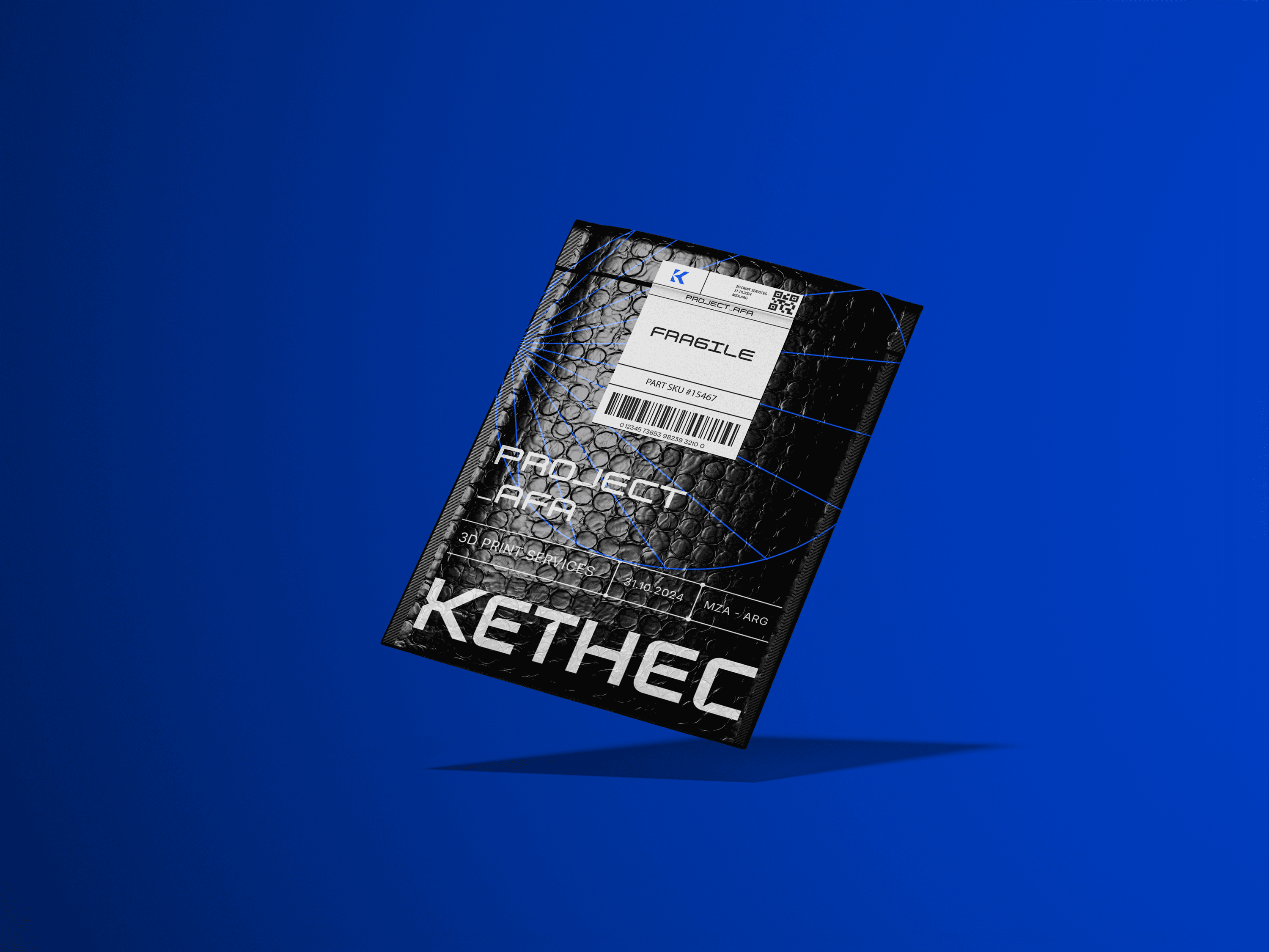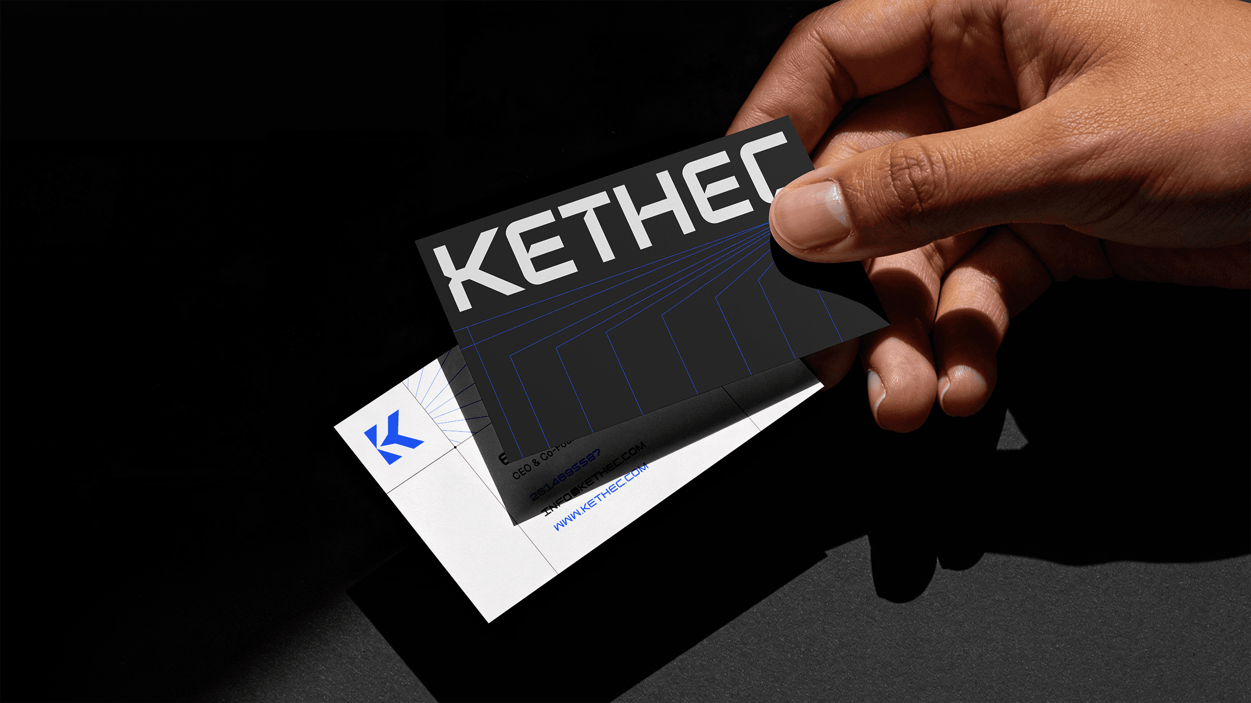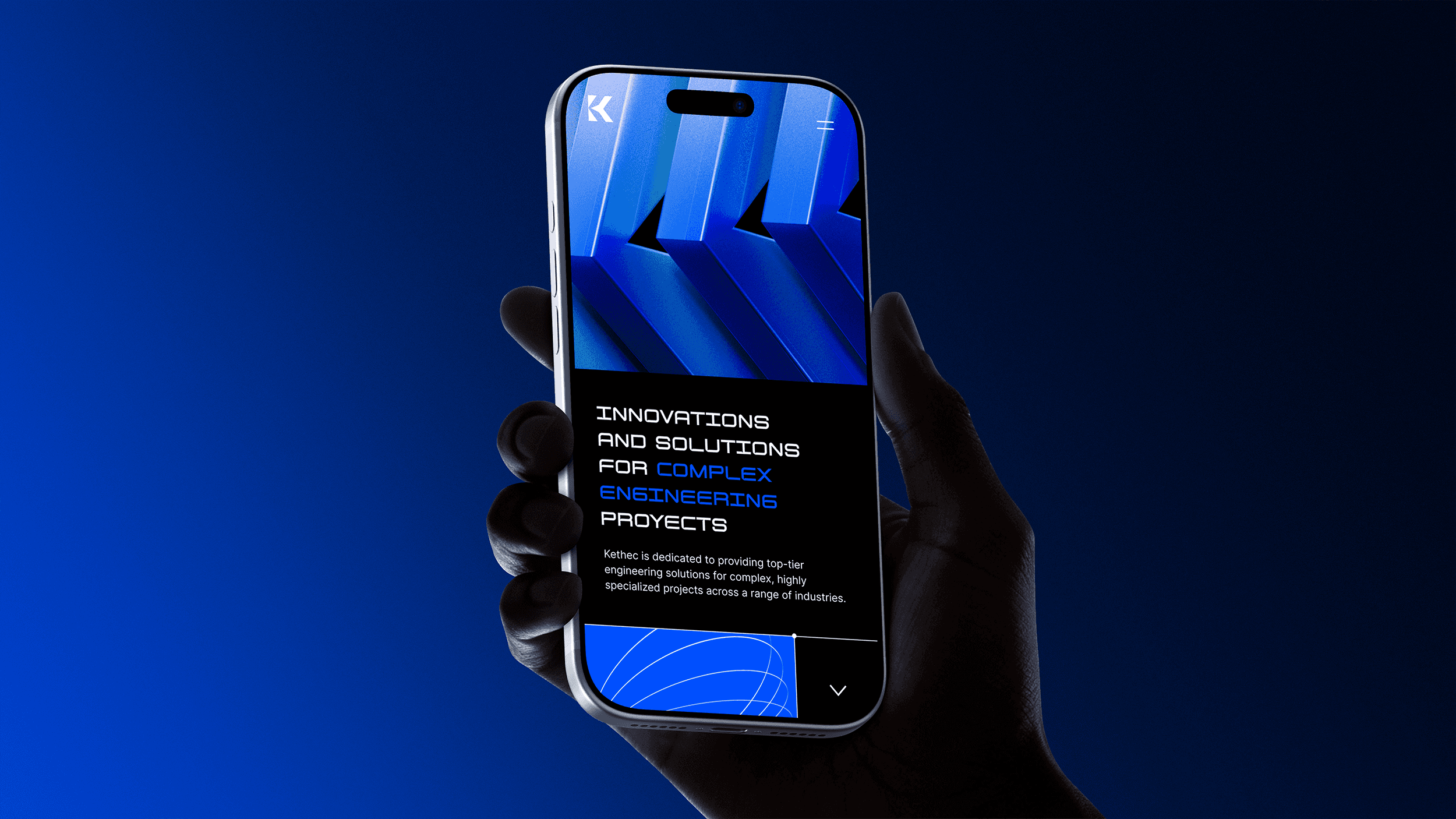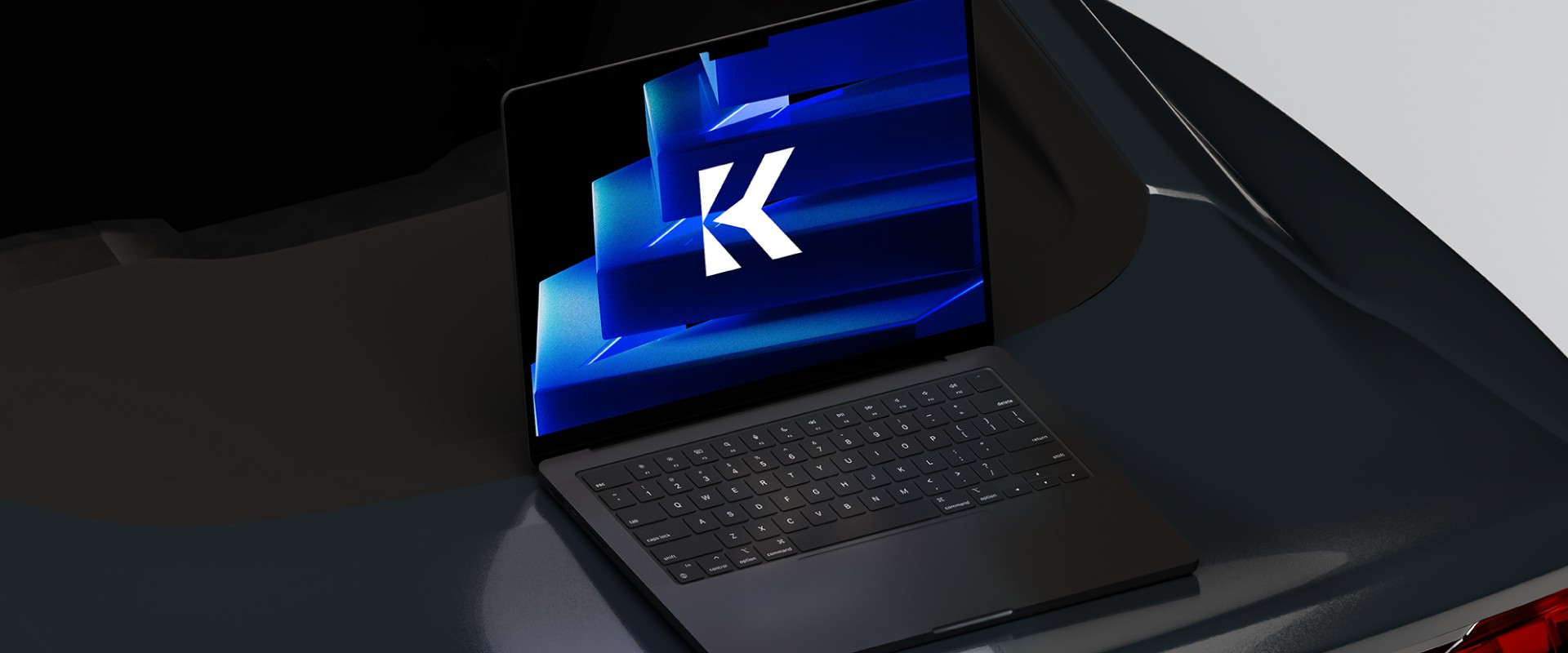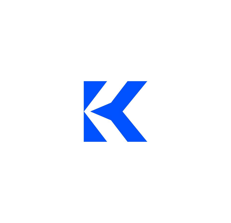 A modern logotype that complements the icon inspired by the union of the letter "K," and an arrow that symbolizes progress. The visual identity is enhanced by a palette of electric blue, black, and white, exuding energy and sophistication. Geometric dynamic shapes were added to suggest motion and reinforce the concept of evolution.